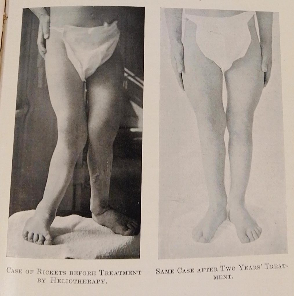 Photo showing child patient with symptoms of rickets and after treatment by heliotherapy (Plate VII, opposite p. 142 in Hill and Campbell 1924)